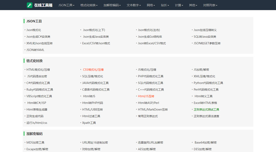 在线工具箱是一个专注于提供各类在线工具的网站,旨在为用户打造一个便捷、高效的工具使用体验。网站涵盖了JSON工具、格式化转换、加解密编码、文本数字、网络工具、站长工具、计算工具、其他工具以及对照列表等多个功能模块,满足用户在不同场景下的需求。无论是专业人士还是普通用户,都能在这里找到自己需要的工具。