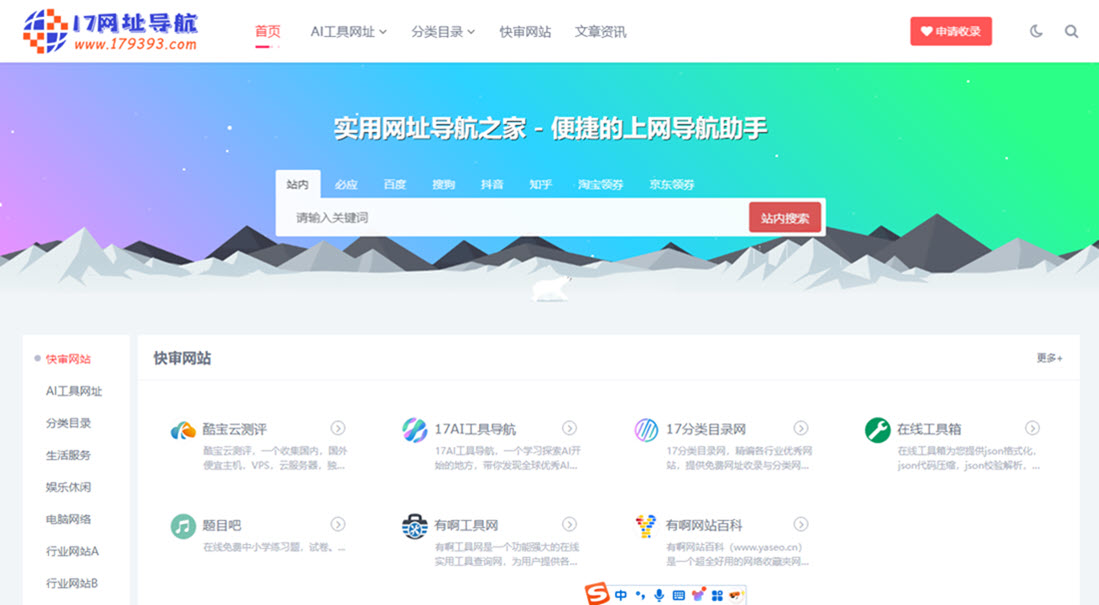 在互联网的广阔海洋中,寻找优质网站犹如沙里淘金,既费时又费力。而 17网址导航 犹如一位经验丰富的向导,为网民们指引方向,帮助大家快速定位到各类精品网站,同时也为网站运营者提供了免费的网站收录服务,助力网站提升曝光度。